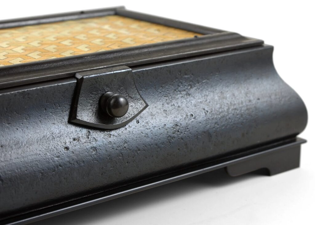 Member Seth Gould is an extremely talented blacksmith and metalsmith whose work ranges from elegant hand forged tools, to ornamental vessels and lock boxes. Seth studied the traditional art of nuome zogan overlay in Japan, and he incorporates geometric, gold leaf patterns in a striking contrast with his forged iron forms. Check out his Instagram for more of his work.